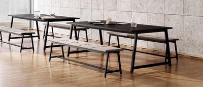 Pinnacle fully upholstered bench seat and black powder coated steel frame. Designed for café, break-out, collaborative area or home kitchen.